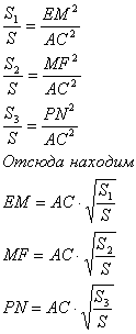 Задача №120Через точку М, лежащую внутри треугольника АВС, проведены три прямые, параллельные его сторонам. При этом образовалось три треугольника, площади которых равны S1,S2 и S3. Найти площадь треугольника АВС.![]() Легко видеть, что треугольники ЕКМ, MQF и РМN подобны треугольнику АВС. Пусть S - площадь треугольника АВС, тогда ![]() А так как ЕМ=АР, MF=NC, то EM+PN+MF=AP+PN+NC=AC Таким образом,